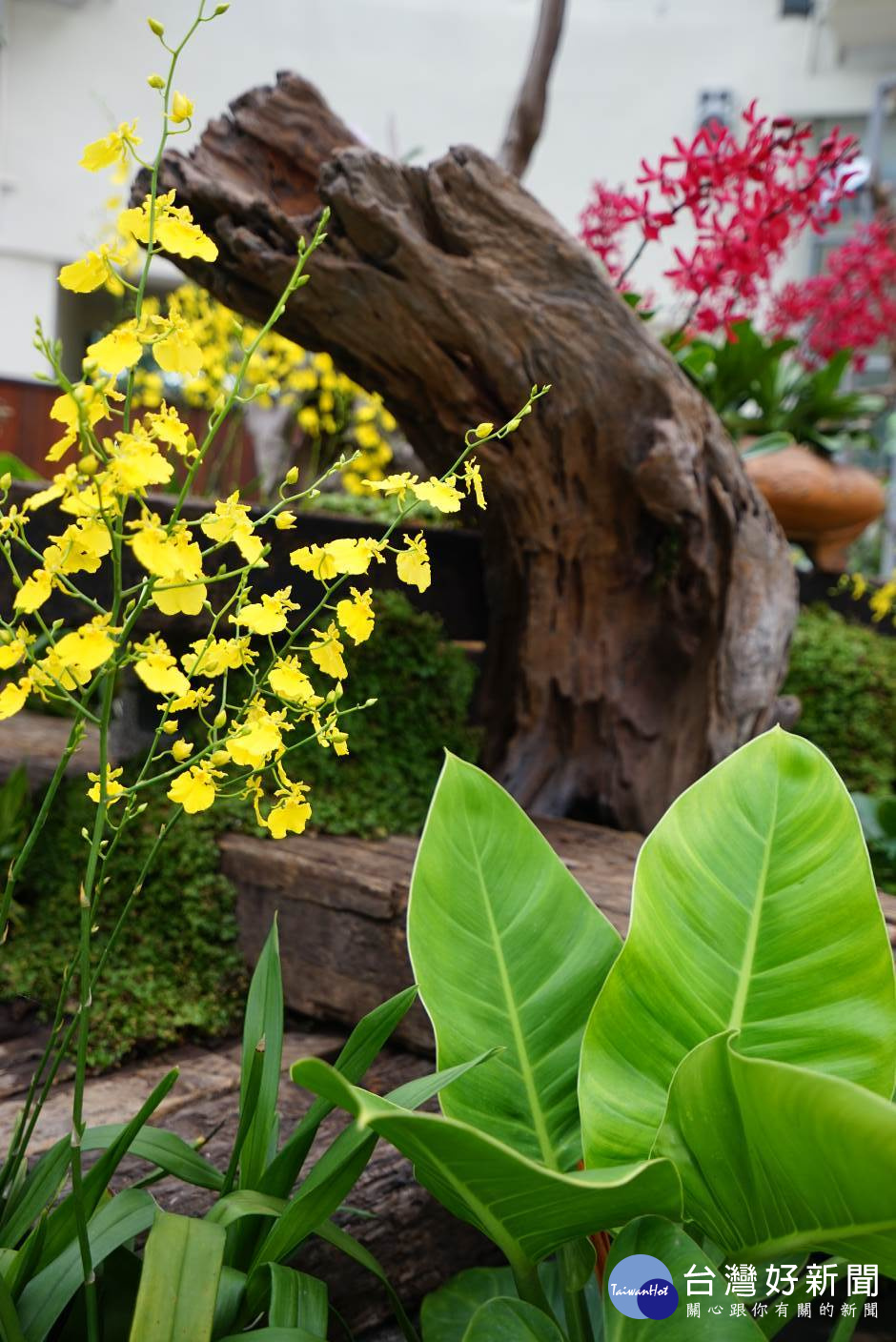 公園處表示,樹木帶給我們的好處多多,從樹苗開始,一天天茁壯為大樹,帶給我們清新的空氣與濃密的樹蔭,有些樹種會綻放美麗的花卉,有些樹種會結滿纍纍的果實,或是有些可被製作成木材,成為我們日常使用的家具,甚至死亡後也可以有另一個世代的開始!這次公園處利用一般被認為沒有甚麼利用價值的樹根與樹頭搭配古甕與蘭花,創作出美麗的花藝作品,展現樹木帶給我們的生活之美好。