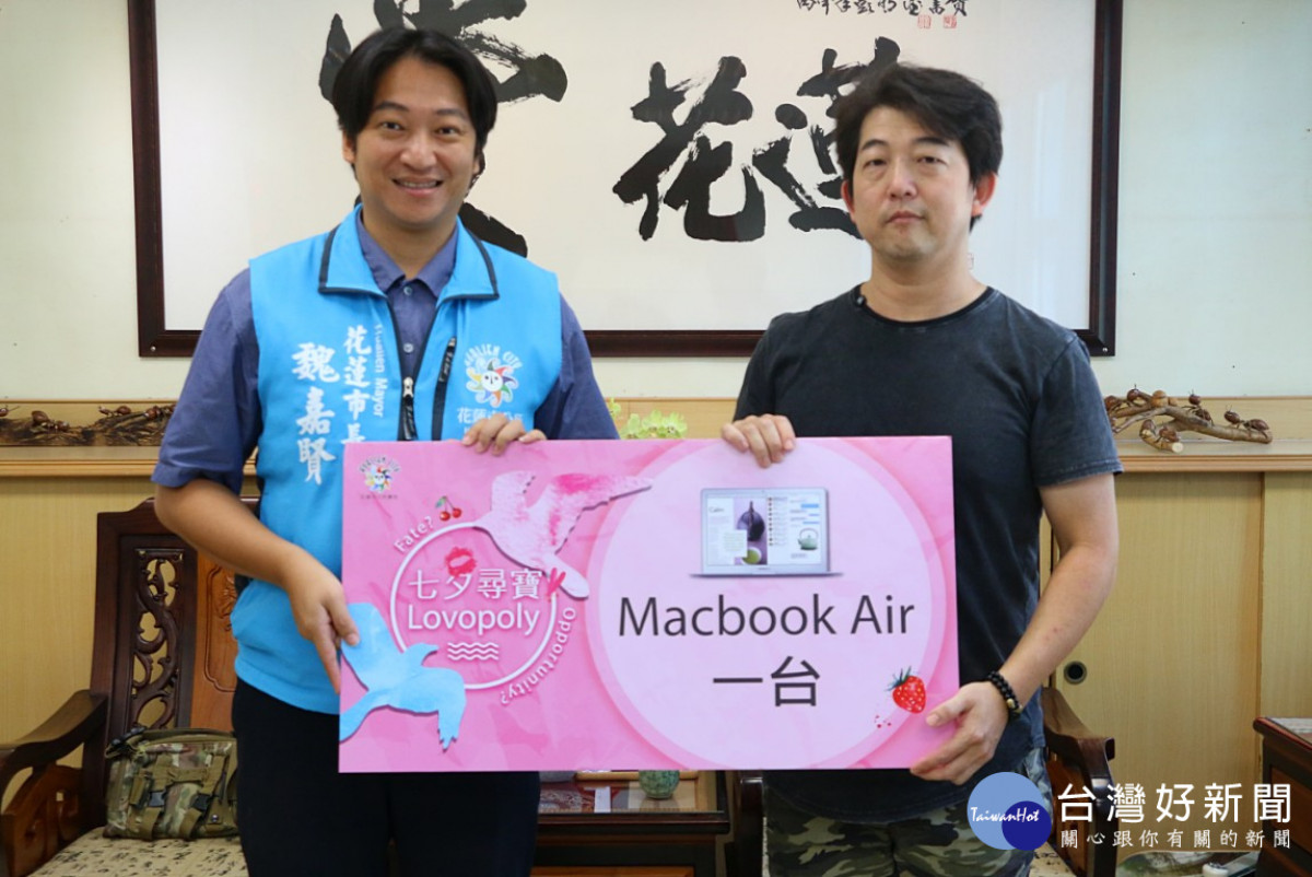 由花蓮市公所舉辦的「七夕商圈Lovepoly」尋寶活動已圓滿落幕,並在日前透過「花蓮市公所」臉書粉絲專頁直播,由魏嘉賢市長抽出尋寶活動的得獎主,計有30位幸運兒獲得遠東500元禮券,及一位最大獎MacBook Air,7日由魏市長親自將大獎頒給王姓市民,並現場開箱見證,為本次活動畫下美好的句點。