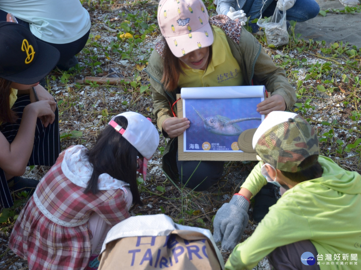 福智團體的志工,現場教導小朋友,塑膠造成海洋生態污染的嚴重性。