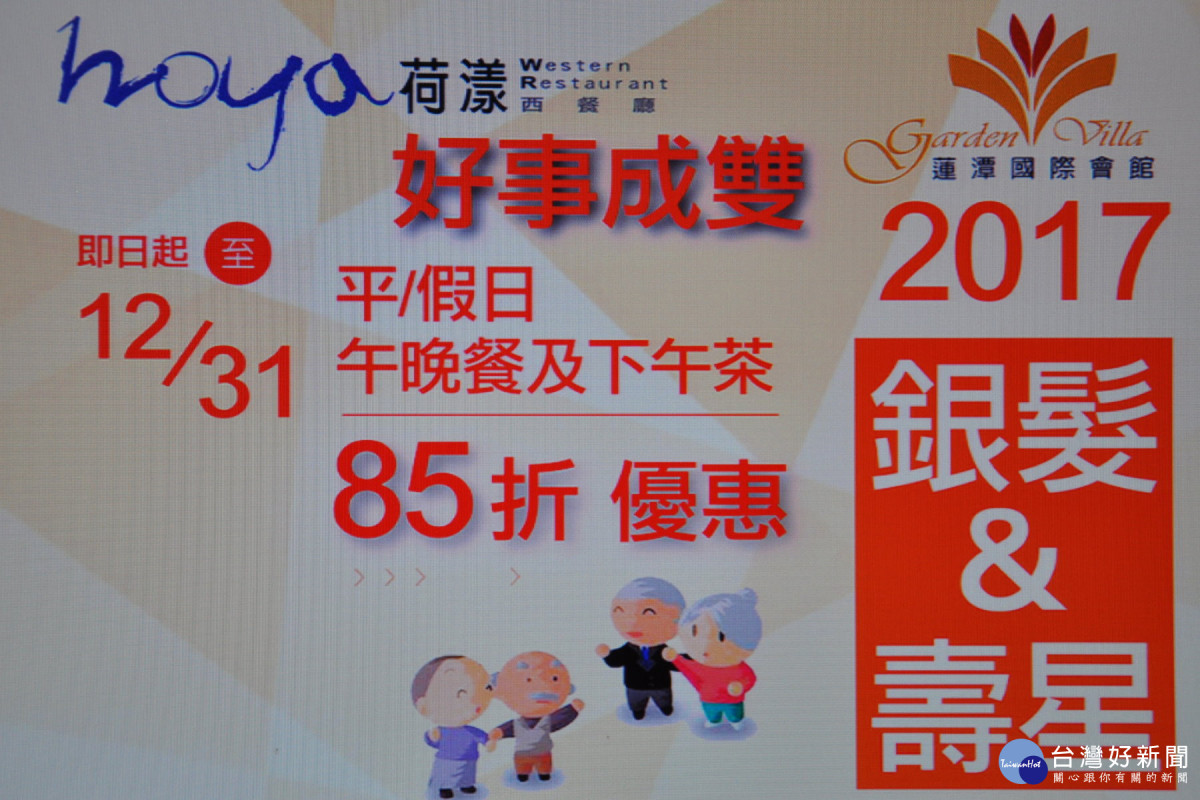 應秀鳳董事長指出,由於近來銀髮族旅遊夯且消費能力很好,為嘉惠銀髮族及壽星,推出好事成雙銀髮及當月壽星優惠專案,即日起至12月31日止,不份平日或假日,憑身份證至荷漾西餐廳消費午、晚餐或下午茶,也享85折優惠,相關詳情可洽服務櫃台。