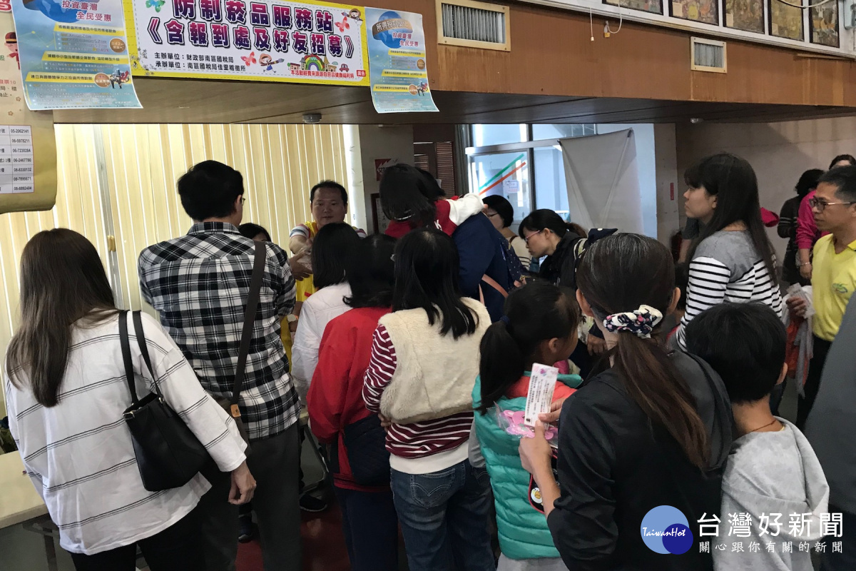 國稅局佳里稽徵所主辦防制菸品稅捐逃漏宣導活動吸引民眾一大者排隊等著參與。(圖/記者黃芳祿攝)