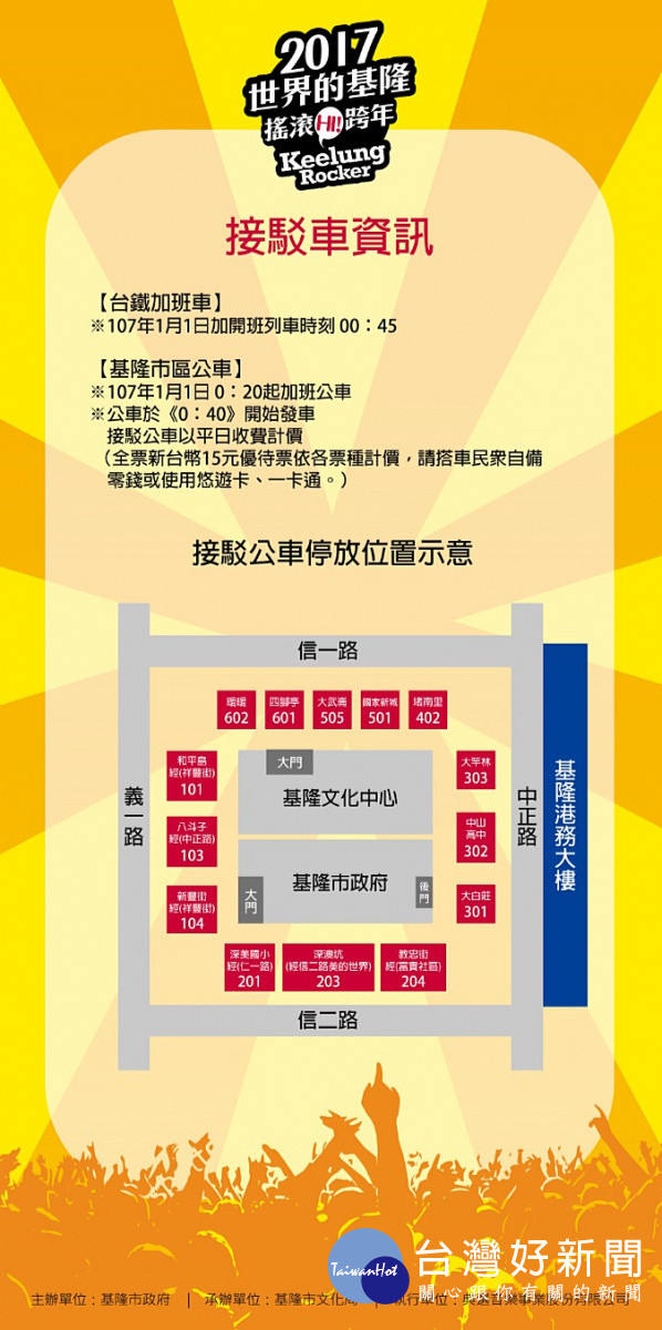 為配合106年12月31日本市跨年晚會活動,基隆市公車處公布交通疏運措施,跨年活動結束時,機動加開14線加班車載運民眾,行駛路線如下:101和平島(經中正路)、103八斗子(經祥豐街)、104新豐街(經中正路)、201深美國小線(經仁一路)、203深澳坑線(經信二路、美的世界)、204教忠街(經富貴社區)、301太白莊、302中山高中、303大竿林、402堵南里、501國家新城、505大武崙、601四腳亭、602暖暖等計14線公車(於文化中心、市政府周圍道路停等),從跨年活動結束時00:40起發車,加班載送民眾,敬請多加利用。