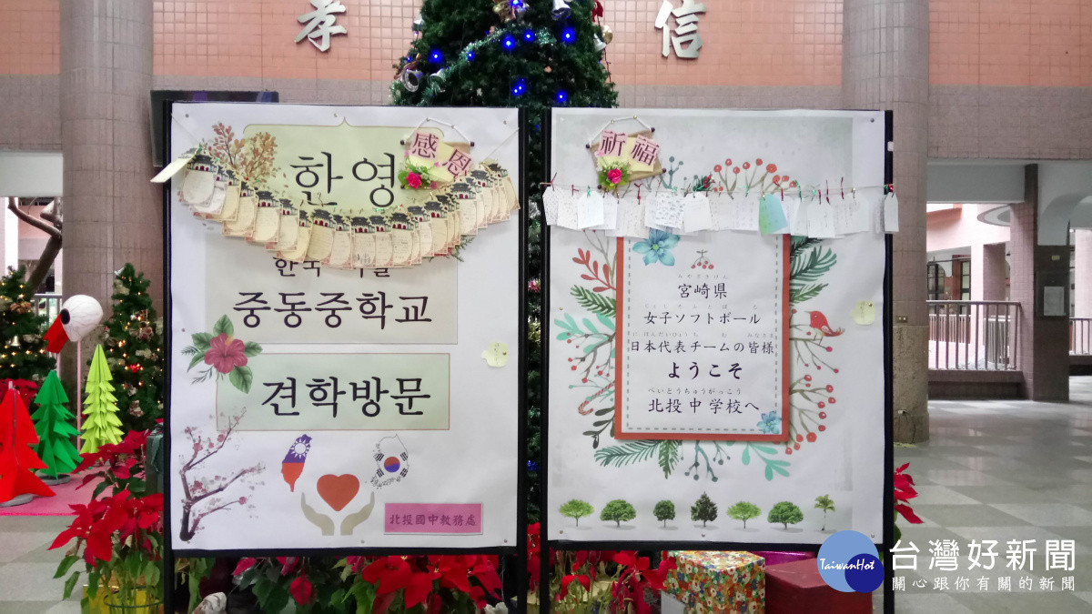 北投國中在歲末年初舉辦系列祈福與感恩活動並融入課程,其中會在校園布置「感恩祝福區」,讓學生寫下對師長、家人及朋友的感謝小語,及對自己未來新的一年的期許與願望。近日來訪的日本與韓國學生,也紛紛參與本活動,寫下自己未來的期望與對北投國中師生的祝福,並一併懸掛在北投國中的穿堂。