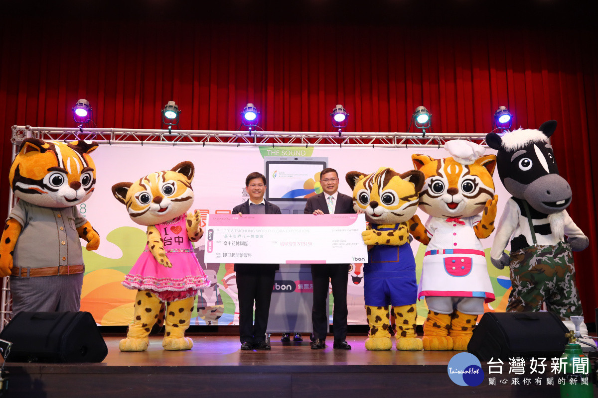 「最早鳥票售票記者會」今(8)日在台灣大道市政大樓舉行,台中花博人氣吉祥物「石虎家族」帶來超萌唱跳演出;林市長在市府交通局長王義川、地政局長張治祥、新聞局主任秘書林尚賢、多位區長等人陪同下出席,市議員陳政顯、翁美春服務處代表也到場致意。林市長與交通局王局長共同按下大型售票機螢幕,列印出第一張最早鳥票,象徵花博票務正式啟動。