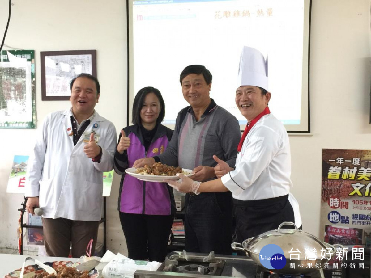 農曆春節將近,希望大家在除舊佈新時,也能知道選擇年菜的撇步,過個美味到位、健康到位的好年!嘉義市西區衛生所結合翠岱里社區,特別邀請聖馬爾定賴柏宏營養師到社區與民眾分享如何選購年菜,外帶年菜怎樣吃才健康的技巧,另外在現場示範製作美味健康又應景的年菜「花雕燉雞鍋」。將重口味的花雕雞結合清爽的蔬菜,中和平常偏鹹的飲食習慣,也能增加年菜的變化性,且在攝取肉類蛋白質的同時,也增加蔬菜、菇蕈類等膳食纖維質及植化素的攝取。