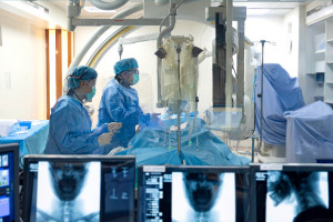 彰基取栓團隊正在導管室中執行緊急手術,與時間賽跑搶救急性腦出血患者,力求迅速取栓,提升病人康復機會。圖/彰基醫院提供