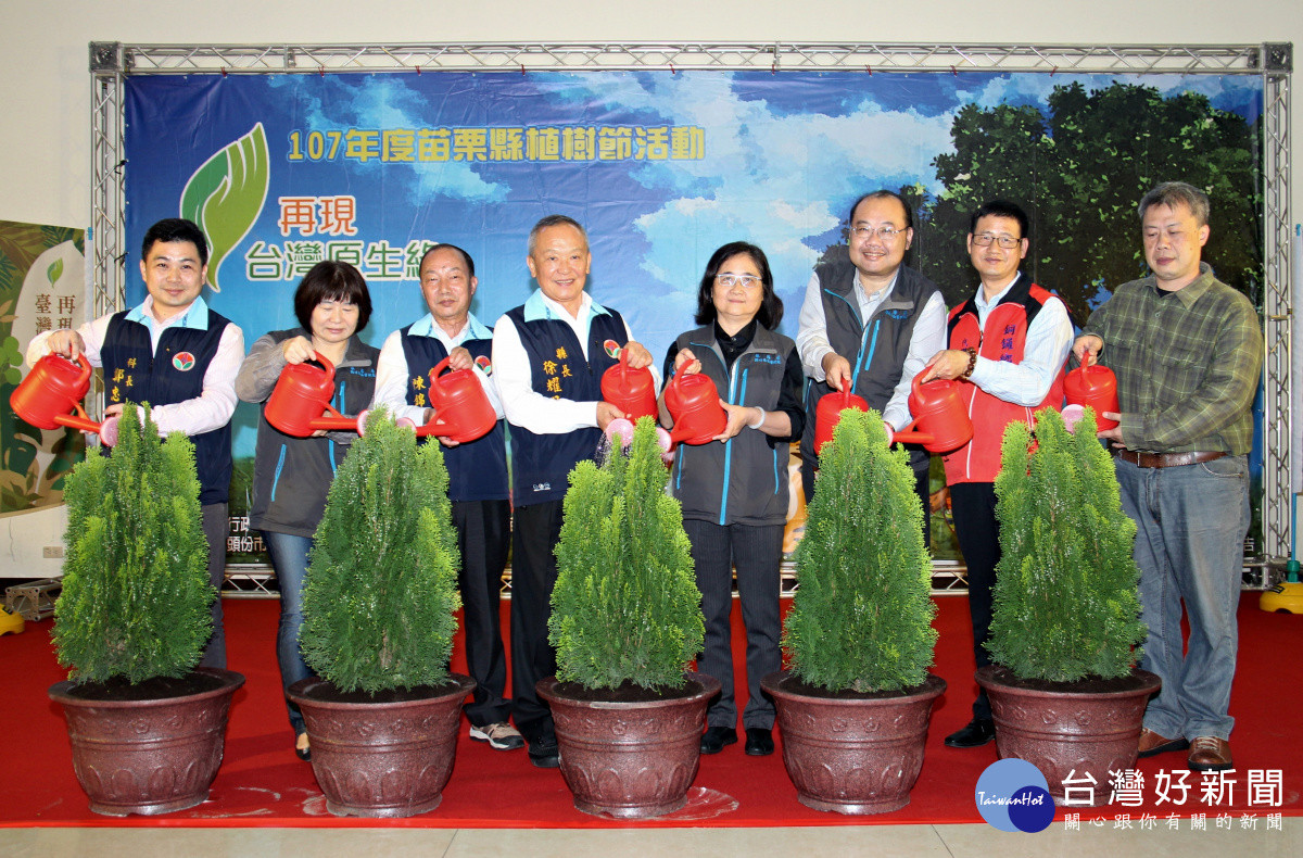 農業處今天在縣府大廳召開107年度苗栗縣植樹節「再現台灣原生綠」宣傳記者會,由芳仁幼兒園小朋友演出輕快活潑的客家歌謠及舞蹈為活動暖場,縣長徐耀昌和新竹林管處處長林澔貞等人一同為綠意盎然的側柏澆水,宣導種樹愛地球。
