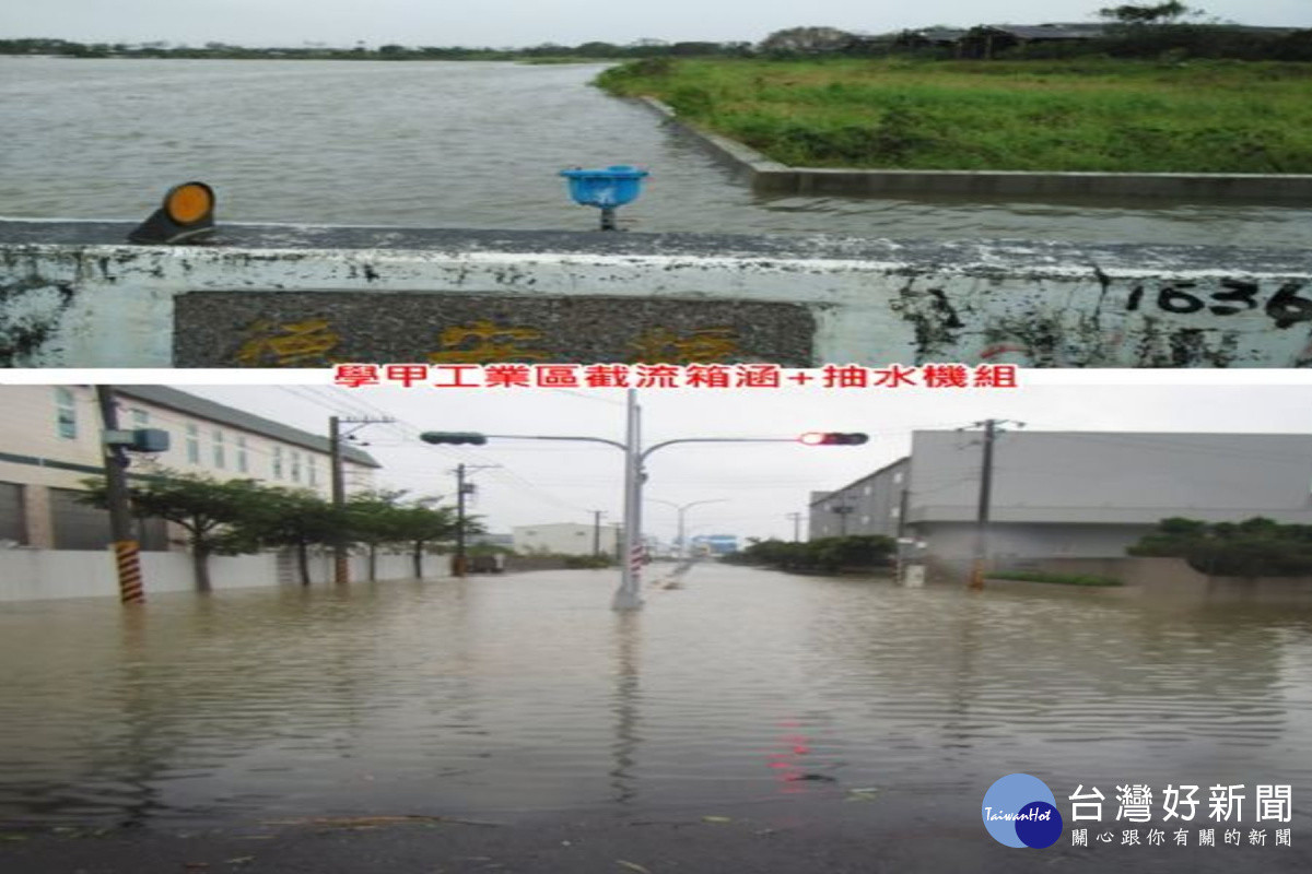 台南市府水利局表示,學甲區工業區位於頭港排水系統瓦寮排水南側,工業區地勢屬相對較低,逢豪大雨期間外水高漲,衍生內水不易宣洩與積淹困擾。為避免外水溢淹造成市區及工業區嚴重水患,已陸續投入治水經費,分期辦理社區部落防護、瓦寮排水沿線護岸加高、截流工程、設置防洪閘門等。