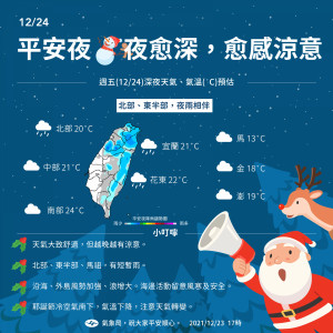 週五的平安夜,氣溫舒適, 北、東部,請帶雨具。注意!耶誕節 (12/25)冷空氣南下,天氣轉冷。【12/24夜晚】馬祖、金門、澎湖:多雲,感受涼冷,馬祖約13°C,金門約1...