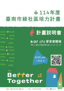 「114年度臺南市綠社區培力計畫」已開始受理報名。市府都發局於9月21日辦理線上說明會揭開序幕!實體說明會將於9月27日七股區鹹鹹夢享村-後港創生中心回歸登場。今年度臺南綠培力期盼能以「地方...