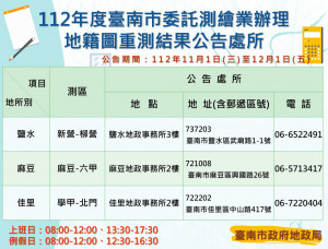 112年度臺南市委託測繪業辦理地籍圖重測於11月1日起至12月1日止辦理結果公告,公告期間可至土地所在地之地政事務所公告場閱覽重測結果,平日服務時間為上午8時至12時及下午1時30分至5時3...