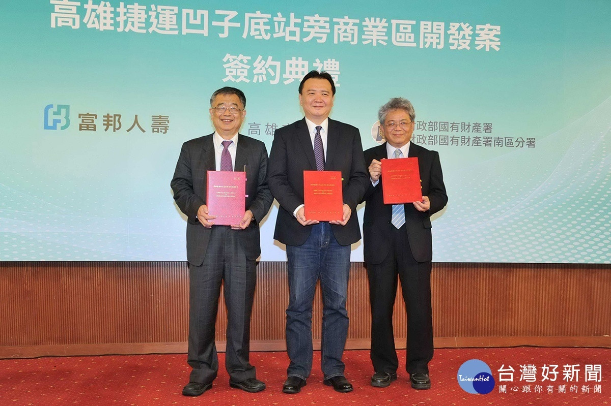 高雄市政府全力推動高雄經濟轉型,市府並積極促進民間參與公共建設,「捷運凹子底站旁商業區開發案」10日於市府四維行政中心進行簽約儀式,由代理市長許立明與國有財產署、富邦人壽保險公司共同簽署,展現市府公私協力的決心與行動力。