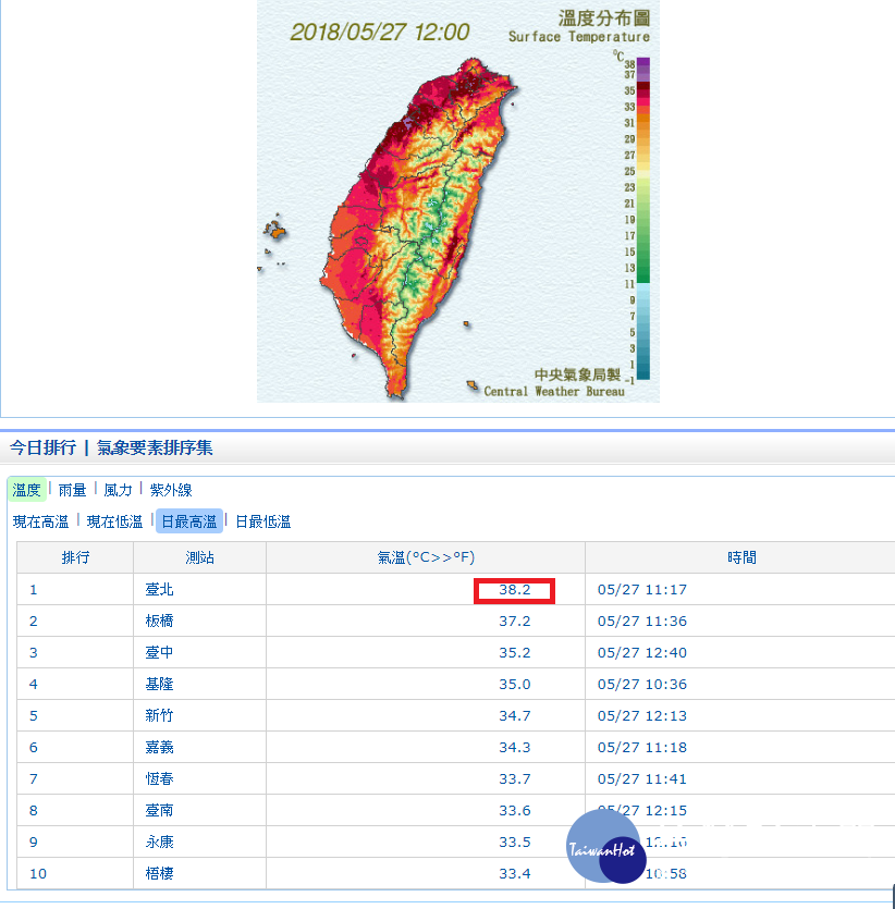這個五月真的熱爆了,全台被烤成「紅番薯」,台北今天中午出現「極端高溫」!中央氣象局觀測,27日上午11時17分,台北市飆到38.2度高溫,不僅是今年全台最高溫,更打破1991年5月台北測站37.7度史上最高溫紀錄。這是台北測站自1896年建站、122年以來5月最高溫。