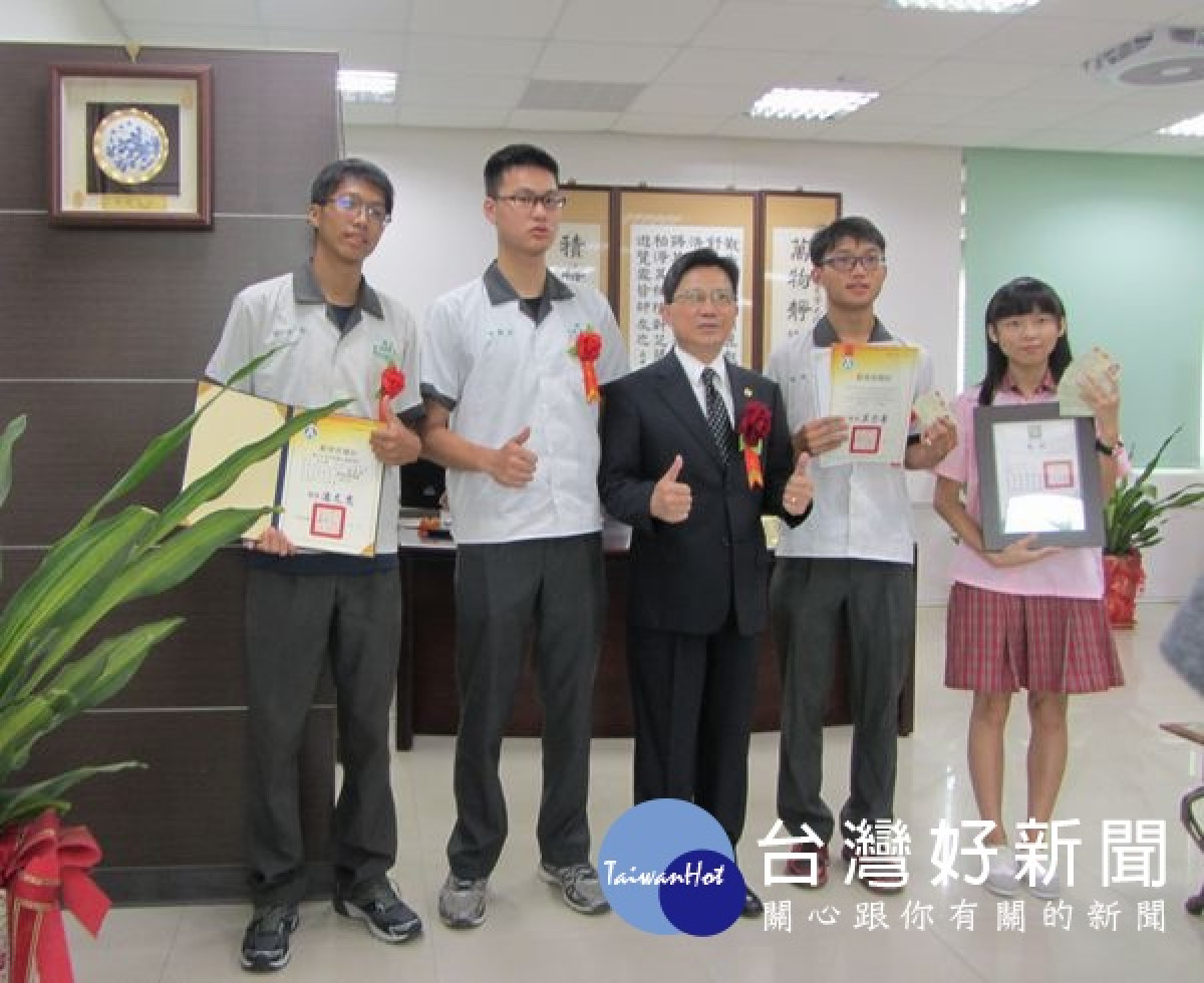廖宏瑩校長讚揚(左起)莊子賢、黃鵬凱、孫洧珅、丁文賢等,特殊的優異表現為校爭光。(記者陳昭宗拍攝)