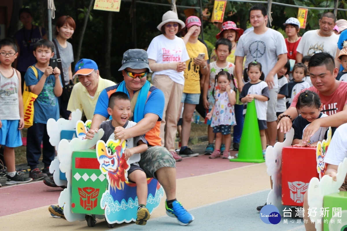 陸上龍舟賽趣味活動由親子參加。