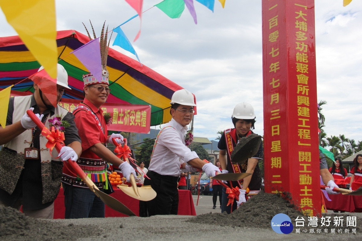 縣府原民處表示,今日辦理動土典禮的大埔部落聚會所,土地係池上鄉公所有償撥用經費350萬元取得, 工程總經費850萬元,其中包含發包工程費738萬元與規劃設計監造及其他費用約112萬元,經費來源為花東基金補助560萬元及池上鄉公所自籌290萬元,池上鄉公所委託林淦淵建築師事務所規劃設計及監造,由崧源營造有限公司承攬工程,工程為期160日曆天,預計於今年底即可完工,其主體建物總面積約272平方公尺,鋼棚聚會所211平方公尺,廁所及儲藏室61平方公尺(18坪),其他設施有停車場、綠地及排水設施等,完成後將提供部落族人多功能使用。