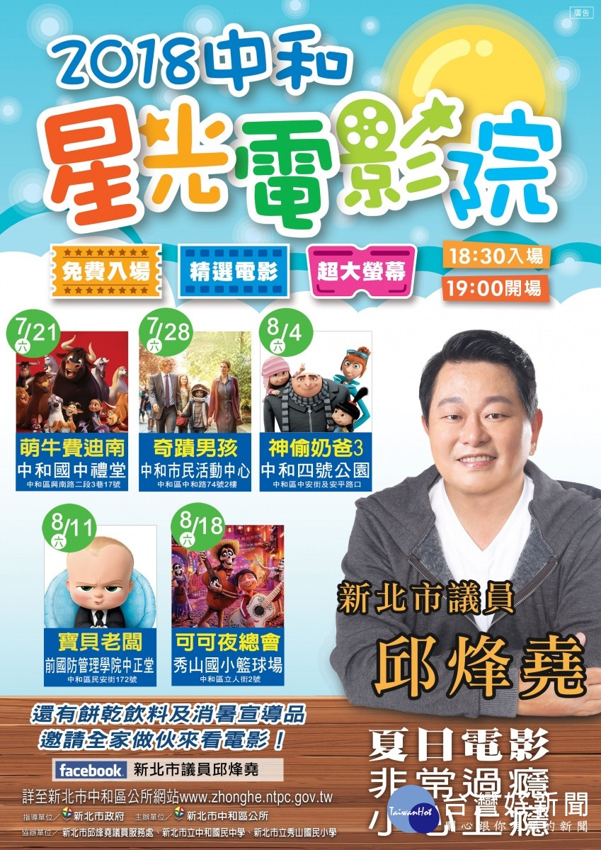 新北市中和區公所今年特別開放影片票選活動,由民眾票選出暑假最想看的五部電影,包含四部熱門動畫「萌牛費迪南」、「神偷奶爸3」、「寶貝老闆」和「可可夜總會」,以及一部溫馨感人電影「奇蹟男孩」,將於7月21日至8月18日,連續五個週六晚上7時起登場,讓您一次看個過癮。