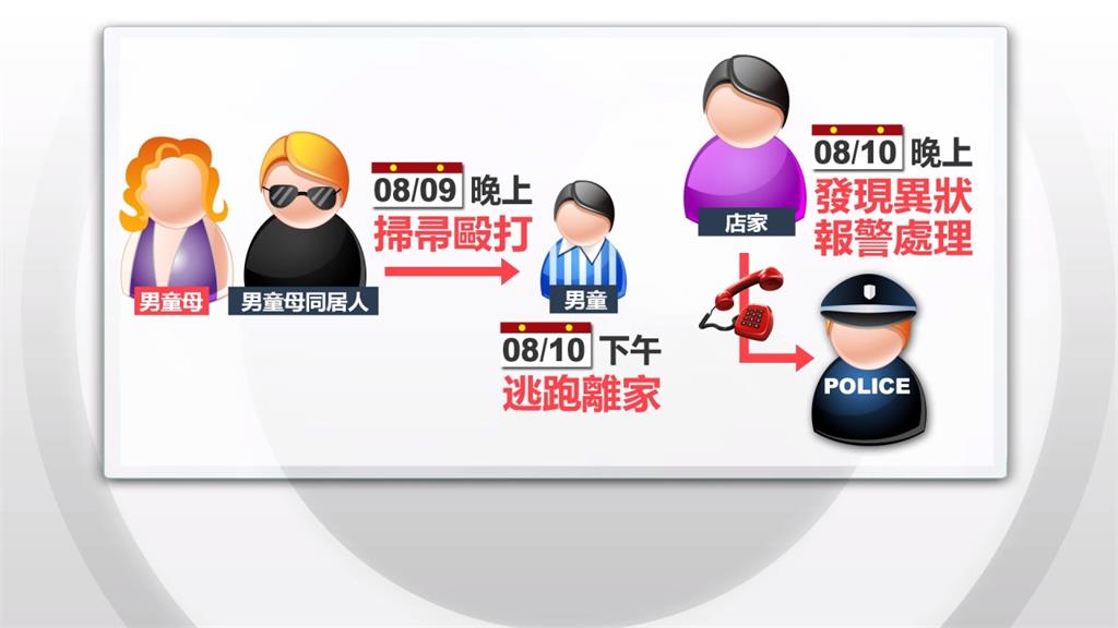 這名7歲小男童,9日晚間疑似因為調皮,被母親和母親的同居人,拿掃帚毆打,10日下午他趁隙逃跑離家,跑到粥店四處張望,老闆發現異狀,上前關心,知道他被家暴,立刻報警處理。