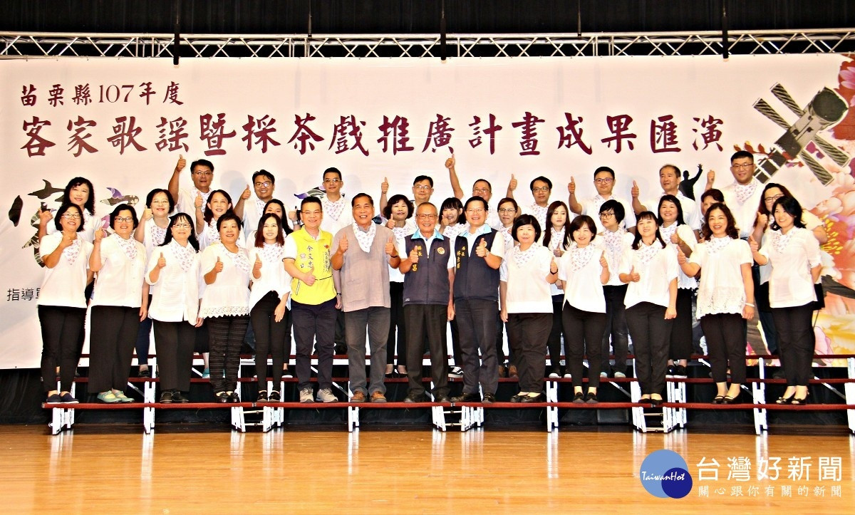 苗栗縣107年度客家歌謠及採茶戲推廣計畫成果匯演,4日晚間在縣府文化觀光局中正堂登場,縣府首支客家歌謠合唱團率先登台,演唱《苗栗係(人厓)个故鄉》等多首歌謠,縣長徐耀昌到場聆賞,鼓勵公教人員學習客家話及傳承客家精神。