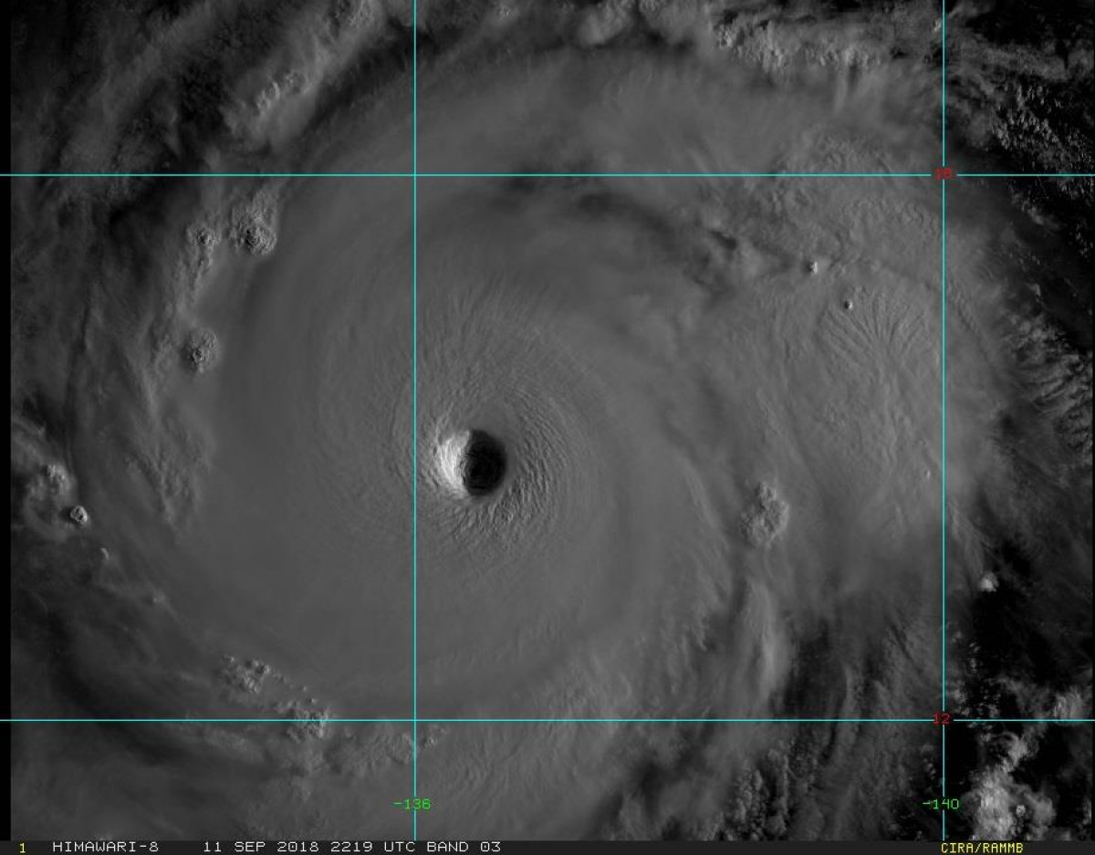 山竹暴風圈擴大,結構完整,颱風眼清晰可見。中央氣象局副局長鄭明典在臉書表示,強颱有一種吸引人的美,很多網路上的同好都是因為強颱的印象而迷上氣象。 當然,大家都知道強颱破壞力極強,很危險,要小心!但是,在心中保留那麼一小塊,欣賞它的美也是可以的!(圖/影像來源:RAMMB/Himawari-8 Imagery)