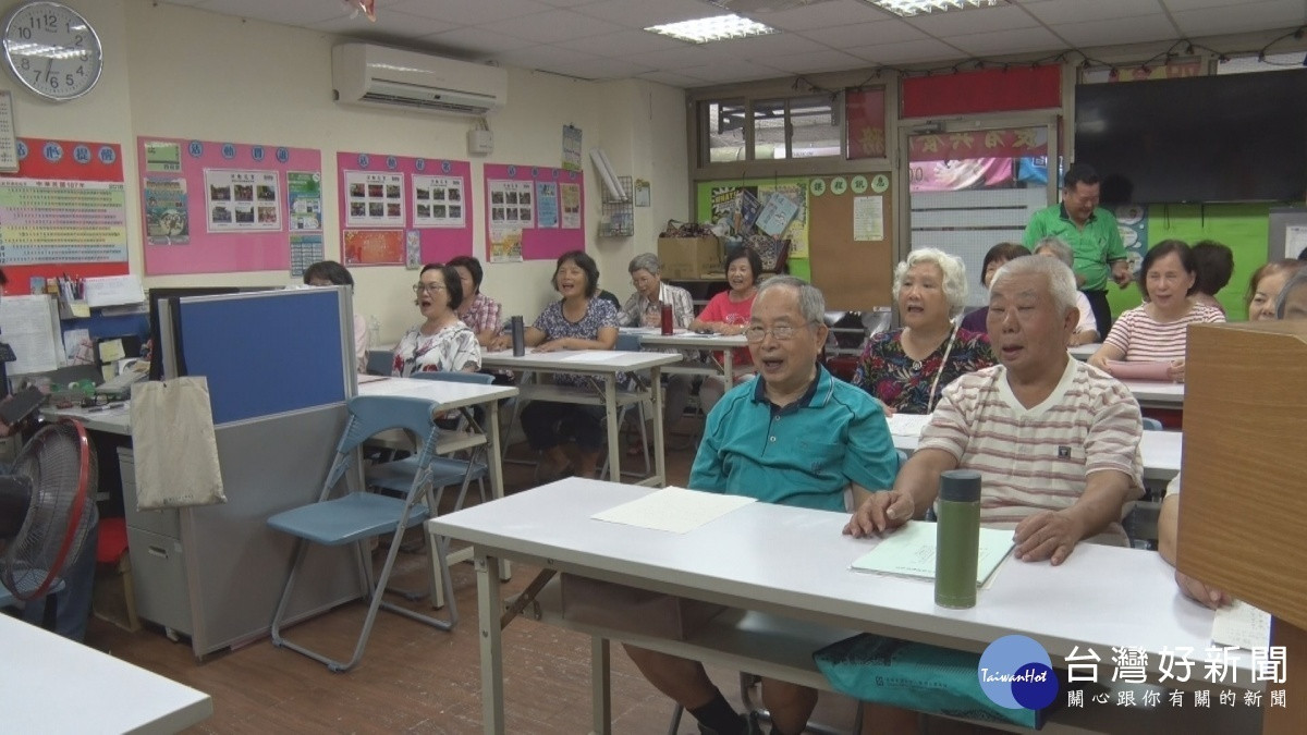 下午時分,信義區四育里活動中心就人潮滿滿,這些里民全都是要來參加歌唱班的學員,在正式唱歌之前,老師先帶著大家做一些肢體運動,舒展肢體。