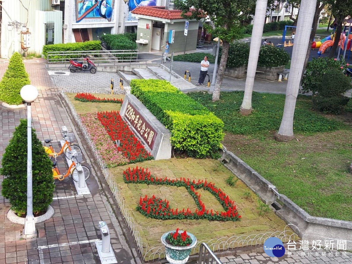 228和平紀念公園,景觀處則配合公園內戶外地板鋼琴設施及228音樂廣場,特別在入口處以多彩繽紛的草花交織出音符的主題意象,向附近居民傳遞音樂帶來的幸福感。