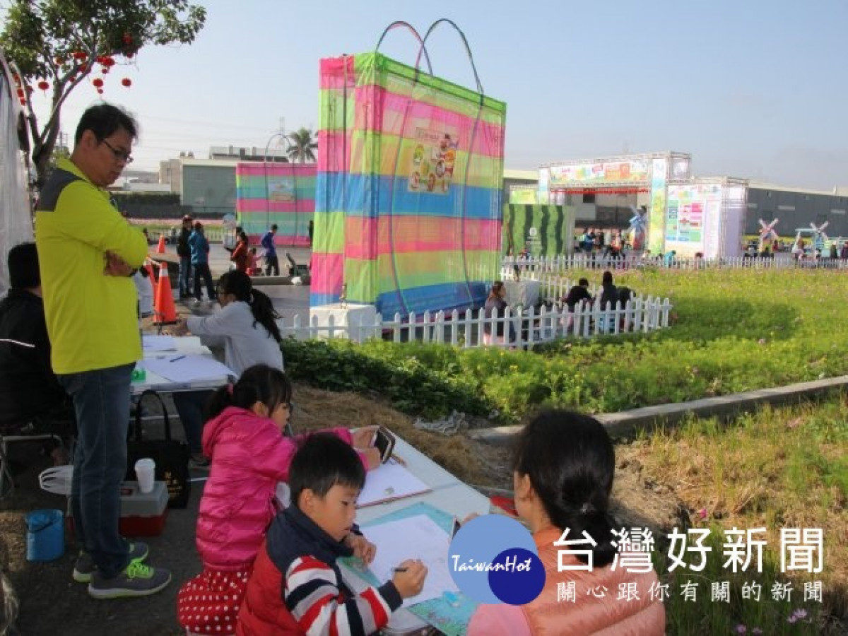 弘光科技大學文化創意產業系執行教育部高等教育深耕計,放大古早味「茄芷袋」15倍,顏色繽紛吸睛,成人氣社區造景,吸引民眾搶著拍照。(記者陳榮昌攝)
