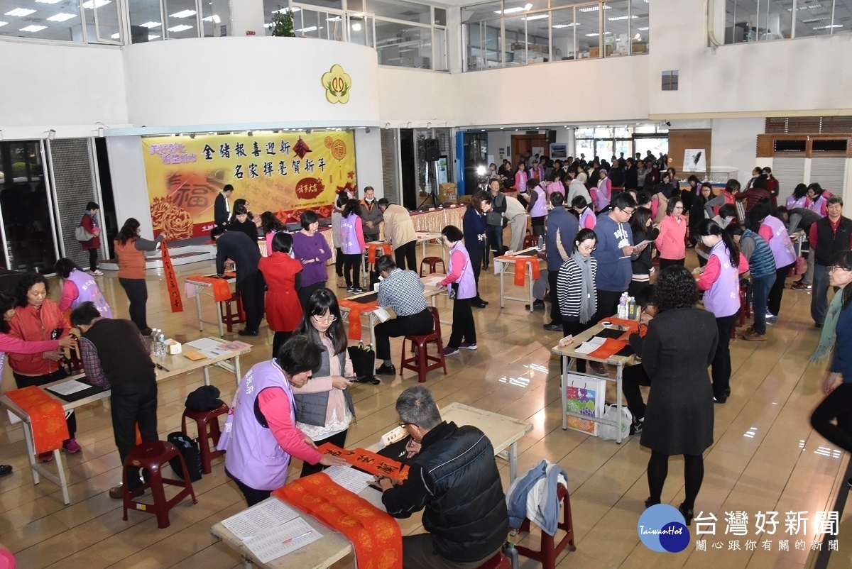 書法家揮毫寫春聯現場人潮滿滿。圖/記者鄧富珍攝