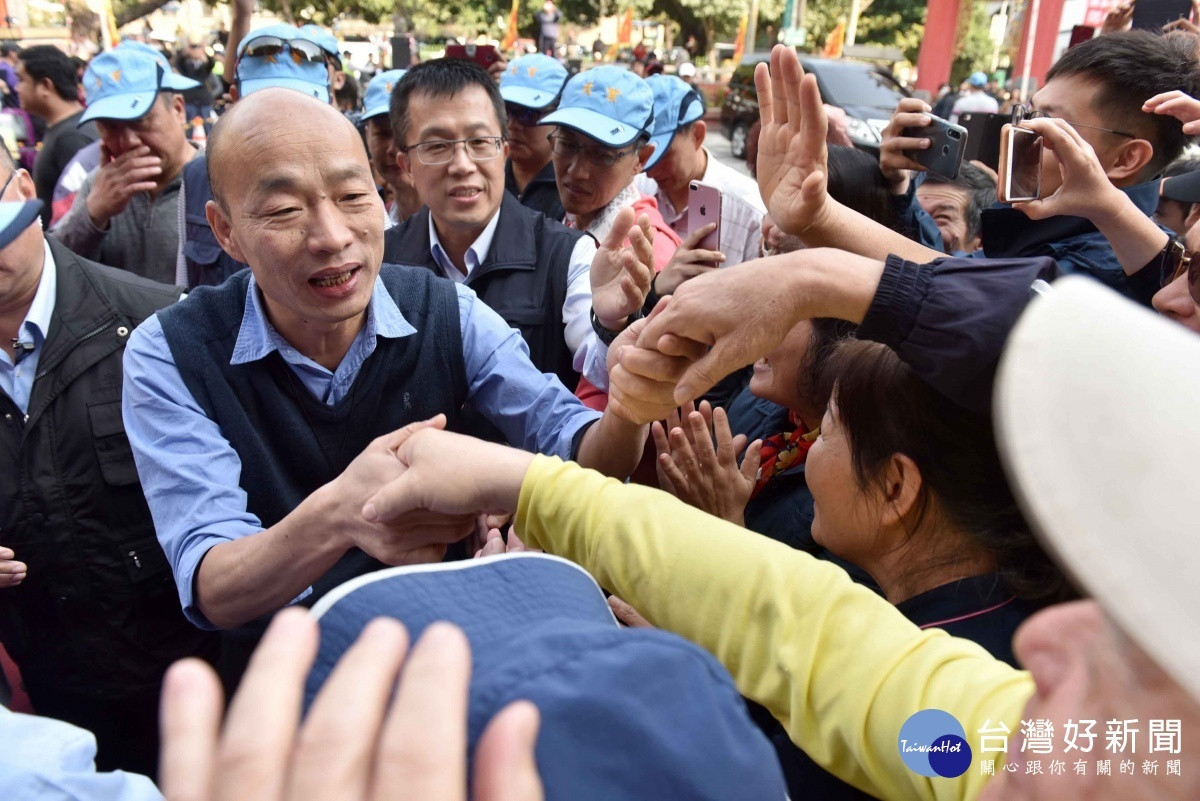 高雄市長韓國瑜1月28下午繼續前往小港區鳳儀宮參香祈福,向現場民眾拜早年,並祝福地方父老兄弟姊妹新年快樂、高雄賺大錢!