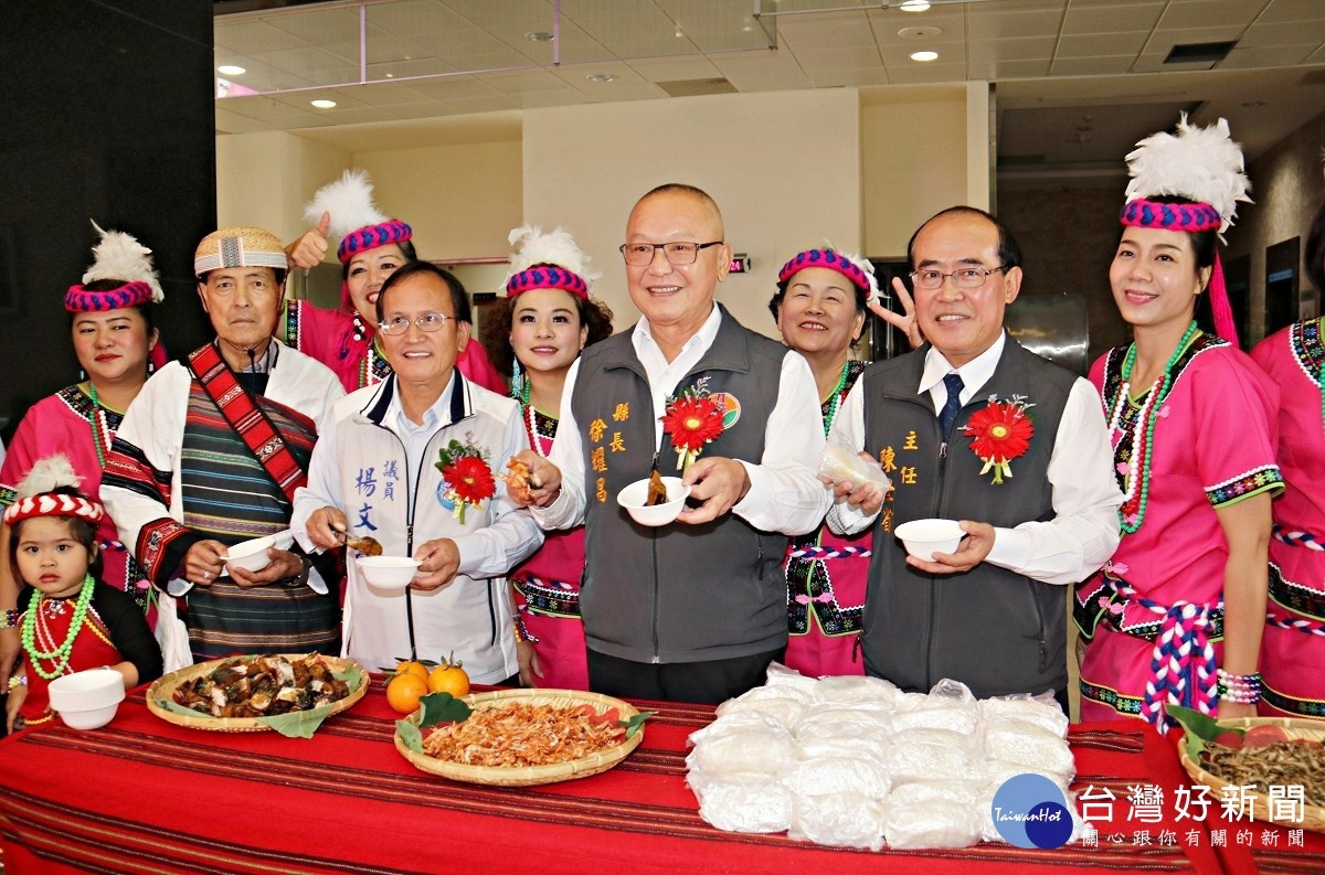 此外,近年來部落體驗旅遊成為國旅新選擇,除了原鄉人文風景,原民風味餐是一大賣點,原民朋友在記者會中端出小米醃製的山豬肉、溪蝦、鹹魚飯糰等特色餐點,撲鼻香氣引人食指大動,縣長徐耀昌也邀請遊客到原鄉體驗原味感動。