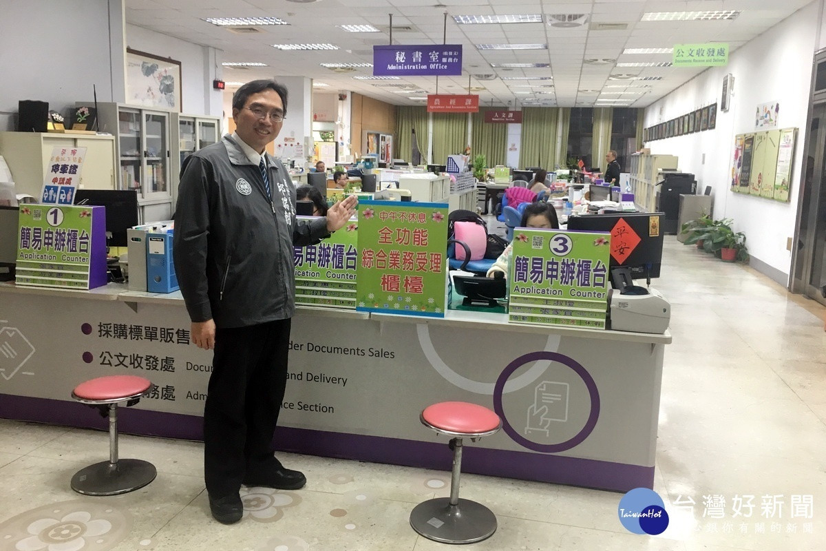 為擴大服務成效,桃園市蘆竹區公所即日起於秘書室設置「全功能綜合業務受理櫃台」,午休不打烊,由秘書室、社會課、民政課及農經課駐衛警協助辦理,提供的服務包括三課室的18項業務,歡迎民眾多加利用。