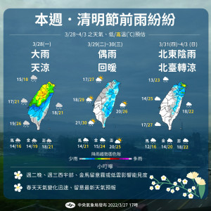 本週清明節前雨紛紛 (週一雨多、二三雨少、北東週四雨再增多),兩波雨勢(週一、週四起),兩波冷空氣(週一、週四起,北臺灣溫度起伏較大)。【3/28~4/3 逐日天氣】3/28(一) :大雨、...