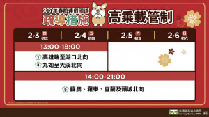 111年春節連假將屆,高速公路局參考近年春節連假交通量及交通特性,實施高乘載管制、匝道封閉、匝道儀控等多項措施,請民眾多加注意。另外,高公局亦提供春節連假期間國道較好走時段,建請需自行開車行...