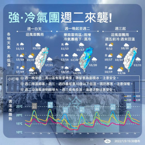 【強烈大陸冷氣團 週二來襲!!】本週天氣,先轉雨降溫,再轉乾偏冷,冷空氣強度在強烈大陸冷氣團至大陸冷氣團間,週三、週四清晨部分平地留意 10度以下偏低氣溫,提醒大家,這波降溫有感,禦寒外套請...