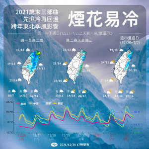 一週天氣三部曲-先濕冷、再回溫,東北季風跨年報到!戶外欣賞絢爛的煙火在空中綻放時,天氣還是有些涼冷,請注意保暖。延續冷氣團和華南雲雨區的影響,使得週二(12/28)清晨之前,各地仍舊感覺比較...