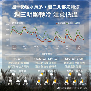 週一(29)天氣較暖,不過水氣多,天氣較不穩定,週二(30)冷鋒先通過,北部有雨並率先降溫,此時中南部還無感。冷雨過後,將逐漸轉乾,但隨著冷空氣南下,週三(12/1)全臺將有感轉冷,請特別注...