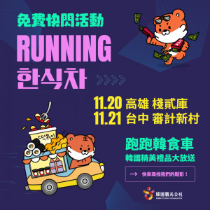 跑跑韓食車免費快閃活動,將在11/20於高雄棧貳庫陸側廣場、11/21於台中審計新村車位廣場舉辦,韓國觀光公社人氣吉祥物Kingdom Friends 虎宗、武熊、鵲尼組成的《Running...