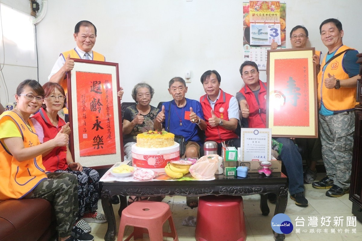 新北市百歲榮民鄧士才5日百歲壽誕,榮民服務處組長陳重榮轉贈總統及行政院院長壽屏及輔導會紀念飾品;另社團法人中華佛教善緣慈善會,轉發其提供的生日禮金。榮服處同仁並與大家一起合唱生日快樂歌慶祝百歲壽誕。
