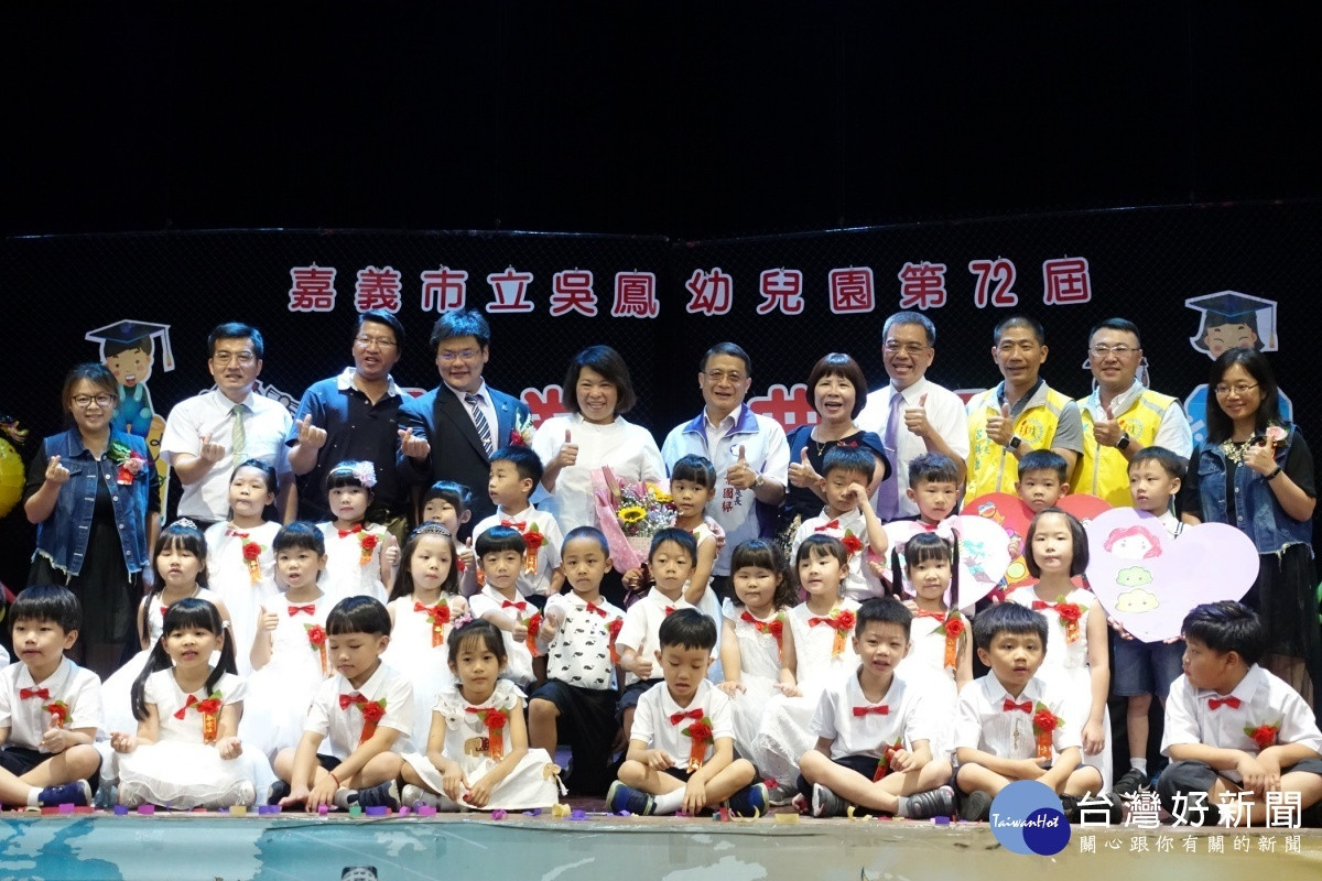 嘉義市吳鳳幼兒園今(21)日在民族國小舉行第72屆畢業典禮,今年應屆畢業生共有三班,有88位小朋友完成了學前幼兒教育。嘉義市長黃敏惠親切地為畢業生鼓勵、獻上祝福,並與孩子們擁抱、合影。畢業班小朋友特別獻上花束,感謝市長媽媽,場面溫馨。
