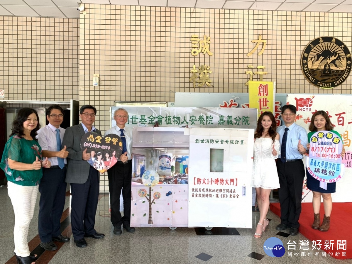 創世基金會嘉義院4日在蘭潭校區瑞穗館為植物人發聲,嘉義大學校長艾群、嘉義市政府文化局長蕭柏勳、嘉義市國立嘉大校友會理事長郭貴葉、豪記唱片歌手楊靜與創世嘉義院院長蕭伃雯,大家對著分貝器大聲喊出「愛消防‧傳平安」一起呼籲為植物人換上一扇防火門,延長黃金救援一小時,讓他們的「家」更安全。