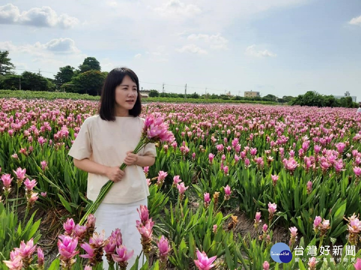 謝衣鳳說,薑荷花外型像荷花,又像鬱金香,也被稱為熱帶鬱金香,特別適合台灣溫暖潮濕的氣候,花形具有荷花的美姿,但沒有「可遠觀而不可褻玩焉」的隔水距離感,是走進田埂裡就可以親近花朵,花顏同樣教人驚艷不已。