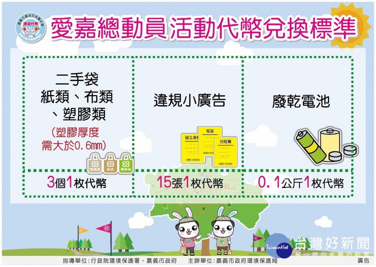 環保局指出,原本活動規定民眾可攜帶3個二手袋(紙類、布類或塑膠類厚度需大於0.6mm)或15張違規小廣告至服務台兌換1枚活動代幣,為慶祝嘉義市資源回收率已達中央訂定的年度目標,市府特別增加兌換項目「廢乾電池」,7日當天只要攜帶0.1公斤廢乾電池,亦可至服務台兌換1枚活動代幣。