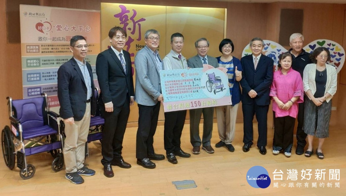 台灣特殊需求者口腔照護學會、新北市牙醫師公會、台北醫學大學牙科校友總會、台北醫學大學牙科校友會新北市分會及土城無極鳳靈宮慈愛同心會等,響應新北市「好日子愛心大平台」,5日共同捐贈市府150台輪椅,祕書長林祐賢代表受贈,將由輔具資源中心分配,提供有需求的弱勢家庭使用。