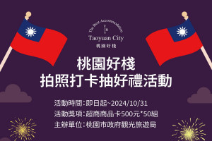 慶祝國慶月,桃園市政府觀光旅遊局攜手桃園好棧旅宿業者,推出「國慶萬聖桃園好好玩~桃園好棧拍照打卡活動」,多家旅宿祭出「旅宿同慶優惠」,十月來桃園旅遊,打卡抽好禮,暢享旅宿超值優惠!市府觀光旅...