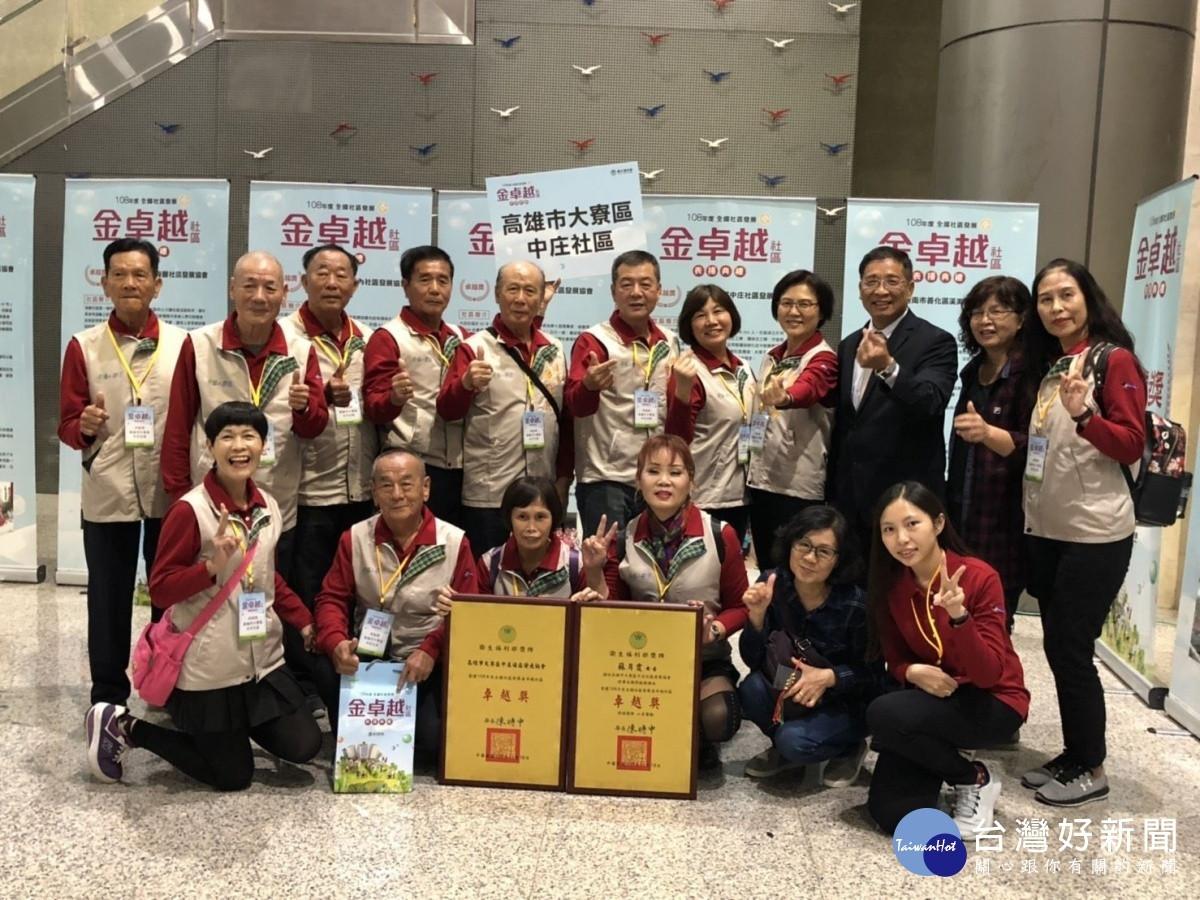 108年度衛生福利部全國社區發展金卓越社區選拔,在眾多社區競評下,大寮區中庄社區脫穎而出榮獲卓越獎,18日上台北接受衛生福利部頒獎表揚。