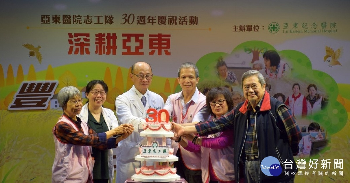亞東醫院志工隊30周年慶,院長林芳郁與社工室熊惠筠主任及志工隊長等切蛋糕慶祝