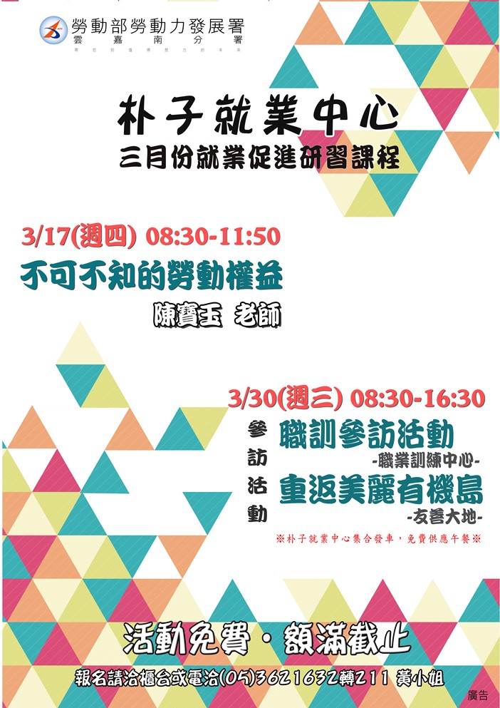如果有就業需求的求職朋友,想了解市場現況及勞動法令常識,或是想參加職業訓練,卻不清楚管道與方法、亦或對於創業有興趣者,歡迎報名3月份就促課程!報名請洽朴子就業中心黃小姐,電話05-3621632#211。欲知更多職場新知、活動,歡迎Facebook搜尋「賈好嘉JobGoodjob 勞動力發展署雲嘉南分署」詳閱更多訊息!