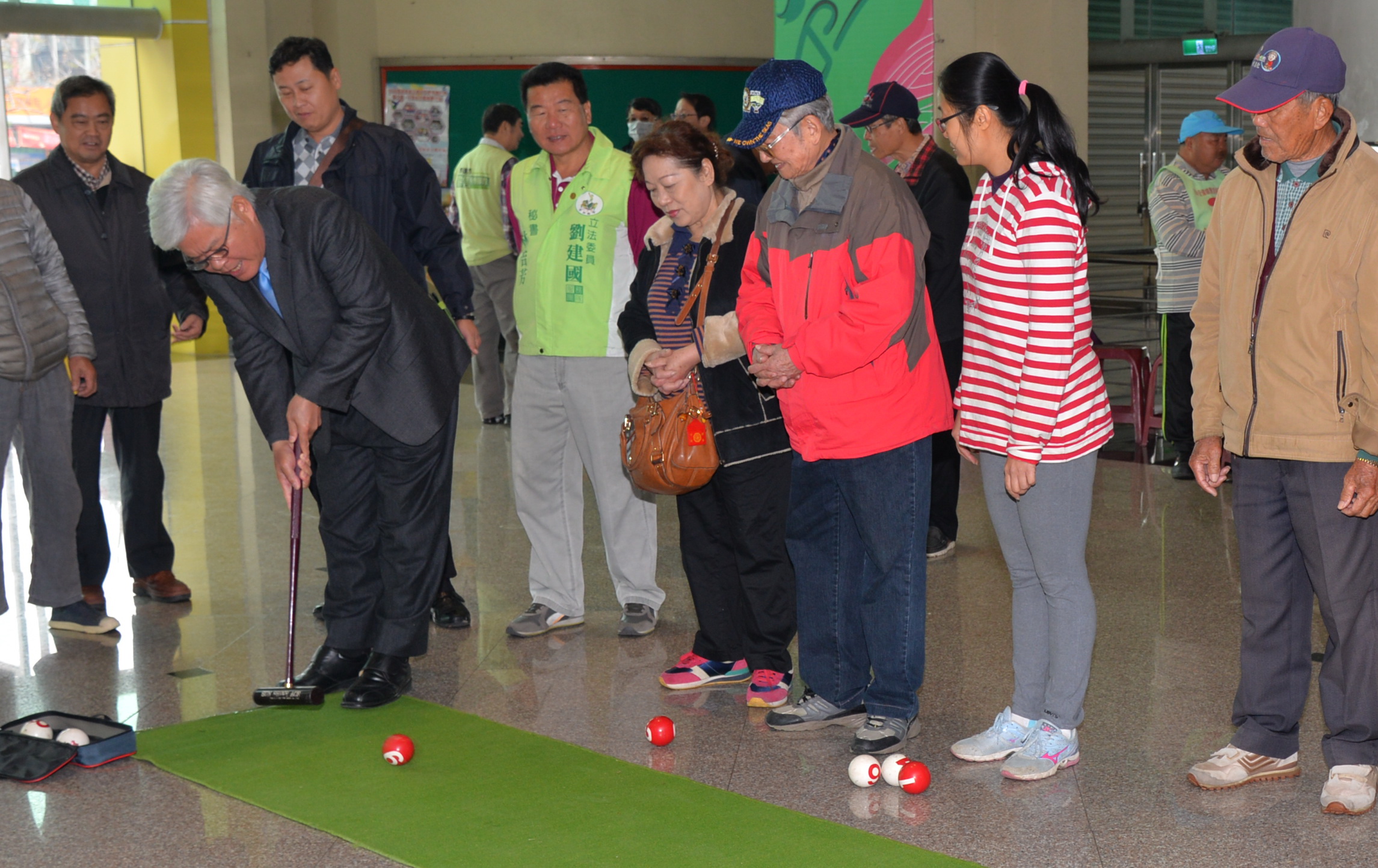 圖說:李縣長也技癢在練習區小試身手,並表示槌球雖容易上手,但還是需要靠長期練習才能增加準確度。(記者蘇榮泉攝)