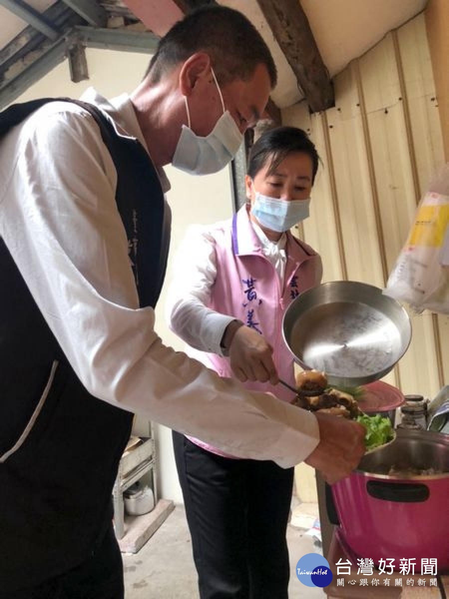 華山基金會邀請長期出錢出力、支持在地老人服務的北港朝天宮蔡董事長及雲林縣議員黃美蘭賢伉儷,以及東陽里長吳春美,下廚煮麵線、滷豬腳,陪伴獨居阿嬤增福添壽。