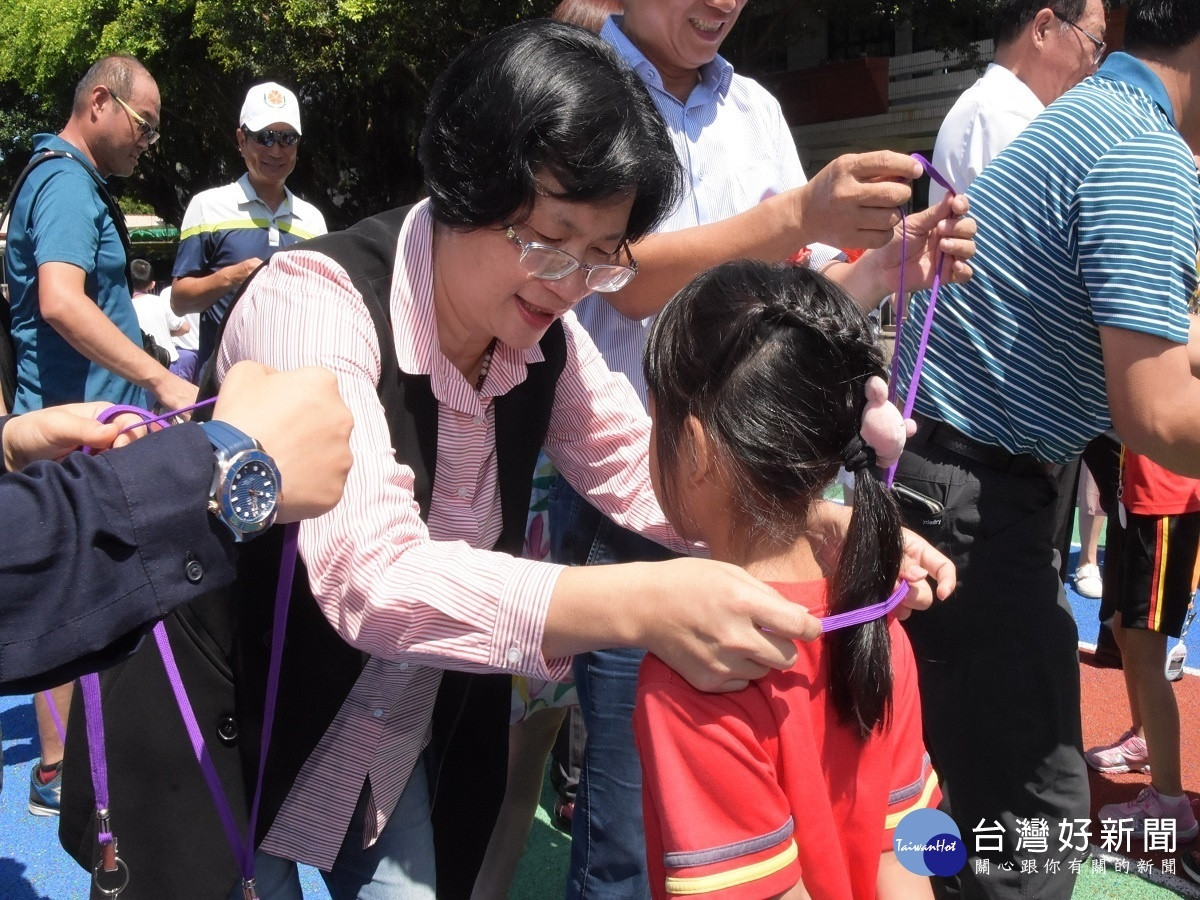 王惠美表示,校長反映校園操場PU跑道已經10多年沒有更新,有斑駁、脫落等現象,造成孩子運動的危險,因此縣府補助385萬元給學校打造彩虹跑道。近幾年縣府已經在田中國小投資約4,500萬元,補強廁所、直排輪練習場、教室耐震係數、數位化教學系統,光是從她108年就任到現在已經補助約2,700萬元,就是希望給孩子更好、更安全的教學環境,期望同學能夠好好珍惜,鍛鍊身體健康,也呼籲同學在國際化的現代,要好好學習英文、AI、物聯網等,才能跟得上時代。